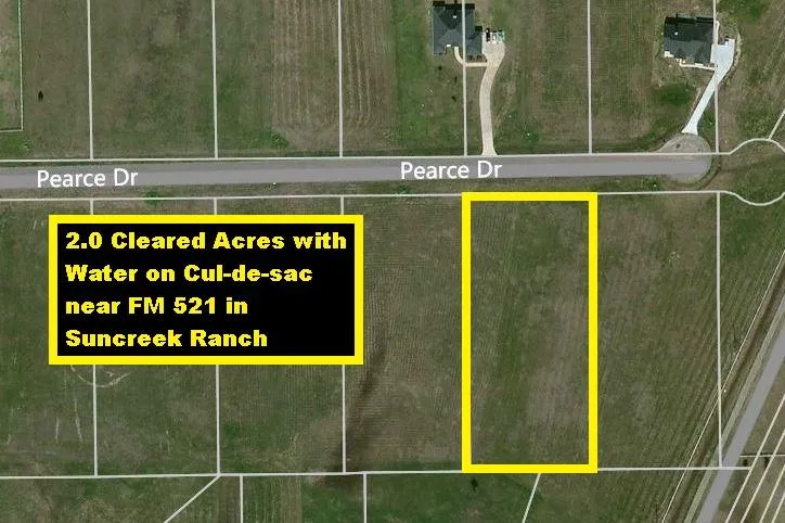 Cleared 2 acre lot on cul-de-sac near FM 521 in Suncreek Ranch. Adjacent 2 acres also available for sale for a total of 4 acres. Quiet community of custom built homes, horseback riding trials, playground, sport court & lake w/boat ramp. 30 miles to Downtown Houston & TX Medical Center via TX-288, FM 521 & Proposed Grand Parkway/TX-99. Close to Pearland & Lake Jackson. Build a dream home, bring your horses, breath clean fresh air & spend nights gazing at twinkling stars. Manufactured home not allowed! Low Taxes! No MUD Tax!