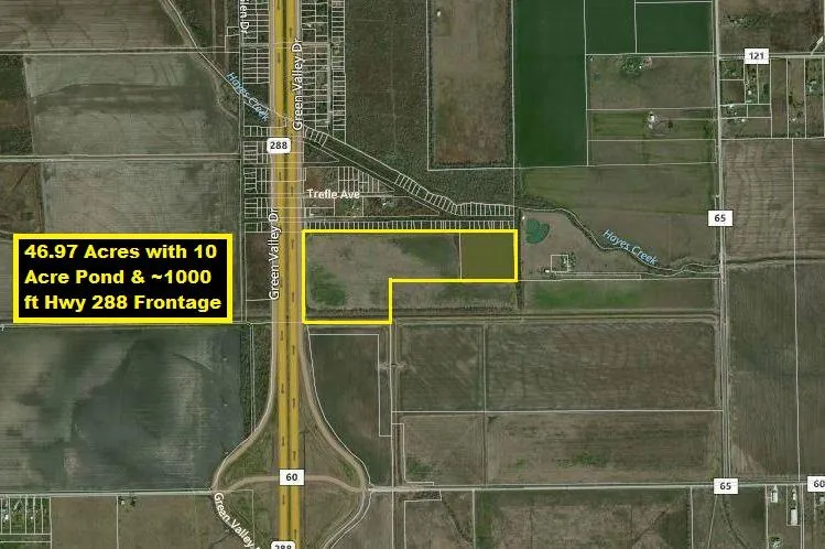 Highly visible ~47 Acres with 10 Acre Pond & ~1000 feet of State Highway 288 Frontage close to FM 521, CR 48 & Proposed Grand Parkway/Hwy 99 (Longest US Beltway & 3rd Houston Loop). Property is cleared with a few trees along perimeter. Creek runs along southern border. Great location for Multifamily, Investment, Buy & Hold, Mixed Use, Commercial Use or Subdivision. Ag Exempt Potential for Ranch/Farmland! 30 miles from Downtown Houston, TX Medical Center, Galveston Beach & Freeport Plants.