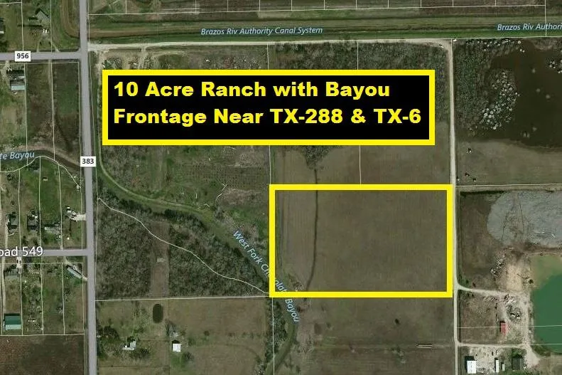 10 Acre Ranch w/Bayou Frontage Close to TX-288 & TX-6. Property is predominantly pastures with West Fork Chocolate Bayou crossing Southwestern corner & a few shade trees along bayou. Property is Not in ETJ or City Limits! Gravel private road accesses property with minimal thru traffic. Secluded! Private! Perfect for Industrial, Commercial, Farm/Ranch, storage warehouses, horse boarding facility, dog & cat breeding/boarding, etc. Very Low Taxes! No HOA Fees! No Pipelines!