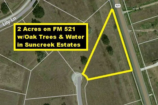 New Price! Partially Fenced 2 Acres on FM 521 in Horse Loving Suncreek Estates. Has Electricity & Majestic Oak Trees! Water provided by Central Water System. Deed Restrictions allow horses but not manufactured homes! Walk to two stocked lakes w/fishing pier, pavilion & fountain. Ride horse/bike to 22-acre park w/playground, sport court & jogging/riding trials. 30 miles to Downtown Houston, TX Medical Center & Hobby Airport via TX-288, FM 521 & Proposed Grand Parkway/TX-99. Close to Pearland & Lake Jackson.