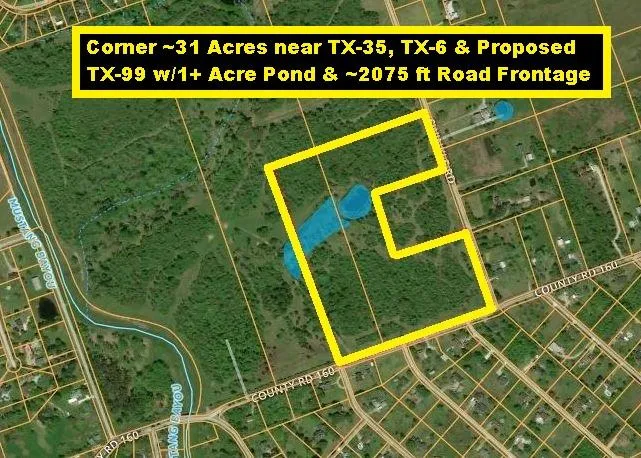 Owner Financed! AG Exempt! Corner ~31 Acres near TX-35, TX-6 & Proposed TX-99 w/1+ Acre Pond & ~2075 ft Road Frontage. Needs Well & Septic! Total 173 Acres Available For Sale (See Pic)! Surrounded by Large Residential Tracts! Proposed 4-Lane Grand Pkwy/TX-99 (Houston's 3rd Loop) will span 180 miles from League City-Rosharon-Katy-Tomball-Baytown (See Maps)! 40 miles to Hobby Airport, Galveston Beach, Freeport, Houston Downtown & TX Medical Ctr. Restrictions Allow Livestock & Horses, but no Hogs or Mobile Homes! See Restrictions in Docs & View Drone Video! Contact Capital Farm Credit for Loan!