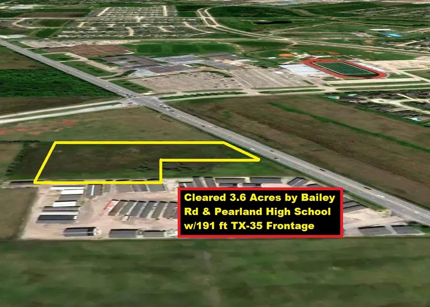 Price Drop! Cleared 3.6 Acres by Bailey Rd & Pearland HS w/191 ft State Hwy 35 Frontage in Pearland Industrial Section. Highly Desired Area Near Pearland Pkwy, FM 518 & Dixie Farm. Land is Becoming Scarce in Fast Growing Pearland. Minutes to Sam Houston Toll, TX-288 & I-45, Prop. TX-99, Local Schools, Police/Fire Depts, Pearland Town Ctr, Pearland Rec. Ctr/Natatorium & Memorial Hermann SE Hospital. Short Commute to 4 Major Universities, Hobby Airport, TX Med Ctr, Downtown Houston & NASA/Johnson Space Ctr. Zoned M-2 Heavy Industrial. Perfect for Industrial Office/Warehouses, RV/Boat/Auto Sales Lot, Auto Repair Shop, Retail Store, Restaurant, Dry Cleaner, Food Truck Lot, Office Building, or Clinic. TX-35 serves as a major corridor running from the cities & plants on the coast to downtown Houston passing Hobby Airport. Portion of TX-35 South of Property Will Be Used by Proposed TX-99 Provid...