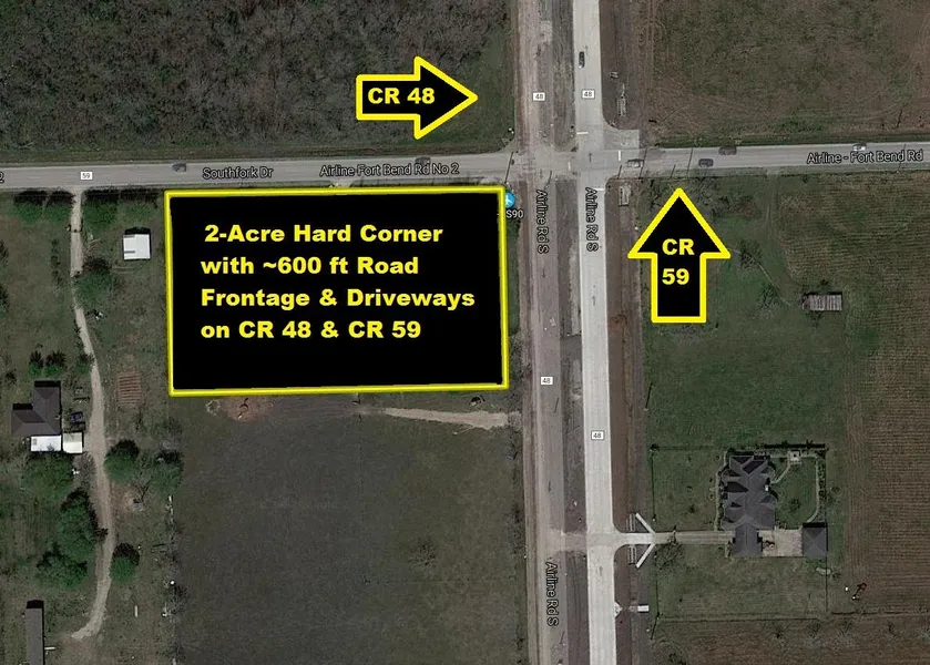 Price Drop! Prime Location for Proposed Traffic Light Corner in Pearland Area! 2-Acre Hard Corner by TX-288 with ~600 ft Road Frontage & Driveways on CR 48/CR 59. Selling for Lot Value Only. All Buildings are Excluded from Sale Price. Access to Buildings Will Not Be Provided for Showings. 24-Hour Advanced Appointment Required to Walk the Property. Contact Listing Agent for Details. Has Electric, Well & 2 Septics! CR 48 is Major Commuting Route to TX Medical Ctr & Houston. CR 59 is Major Commuting Route to FM 521 & TX-288. Minutes to BW-8, TX-6, Pearland Town Ctr, Future Alvin HS (Kirby/FM518) & 5 Master Planned Communities. Pearland ETJ/Outside City Limits. Adjacent 4 Acres on CR 48 Also Available for Sale. Great for Investment, Buy & Hold, Mixed Use or Commercial Use.