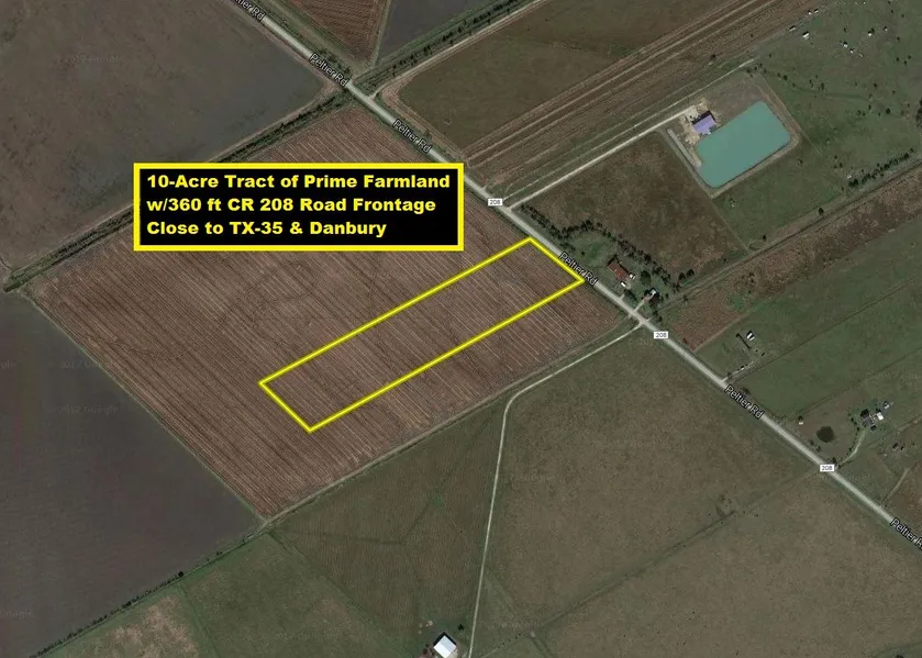 Owner Financed! Ag Exempt! 10-Acre Tract of Prime Farmland w/360 ft CR 208 Road Frontage by CR 210 Close to TX-35 & Danbury. Currently Seeded with Jiggs Hay & Will Be Fertilized in the Spring. Needs Well & Septic Installed! New Survey Will Be Required. Perfect for Livestock, Horses or Hay Production. Minutes to Angleton & INEOS Chemical Plant. 30 Miles to Freeport, Dow Chemical & Lake Jackson. No Mobile Homes or Commercial Allowed! No HOA! Contact Capital Farm Credit for a Loan! Restrictions Are in Process & Will Not Allow Mobile Homes or Commercial. Additional Acreage Available. *Entire 150 Acres is under contract!*