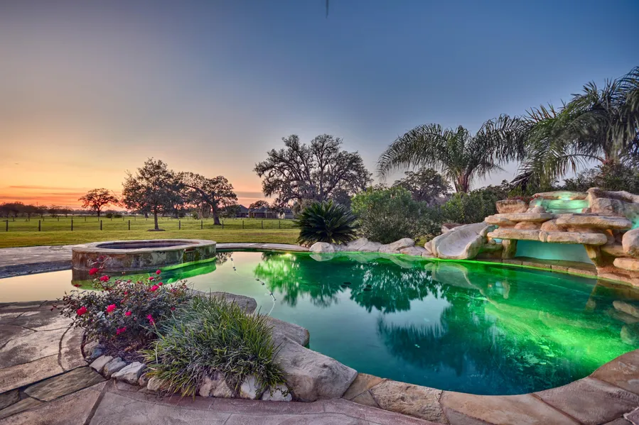 JUST REDUCED! 30-Acre Buffalo Ranch has 3357 SqFtAustin Stone 3/2.5/3 Custom Home. Tree-Lined Circle Drive w/Fountain & Gated Stone Entry. Custom Pool w/Hand-Fitted Carver Stone Decking/Flagstone Coping/Beach Entry/Waterfall/Slide/Hot Tub/Outdoor Kitchen. 3-Car Garage w/3rd Full Bath. 60'x80' Metal Workshop has Overhang, 2nd Half Bath, 2 Roll-Up Doors, Electric, Plumbing, Custom Built-ins & 2nd-Floor Storage. 4-Stall 50'x40' Metal Horse Barn has Pads, Automatic Waterers, Fly Mister System, Wash Rack & Lit Tack Room with Air Conditioning. 100'x200' Lit Outdoor Riding Arena. Outdoor Batting Cage. Historical 1920's George Ranch Home Moved onto Property w/Potential for Guest Home. 2.5-Acre Stocked Pond has Fishing Deck & Outdoor Grill. 30'x30' Hay/Equipment Barn. AG Exempt for Hay & Livestock! Quiet Community w/Custom Homes on Acreage, Playground, Sport Court & Lake. Deed Restrictions Allow ...