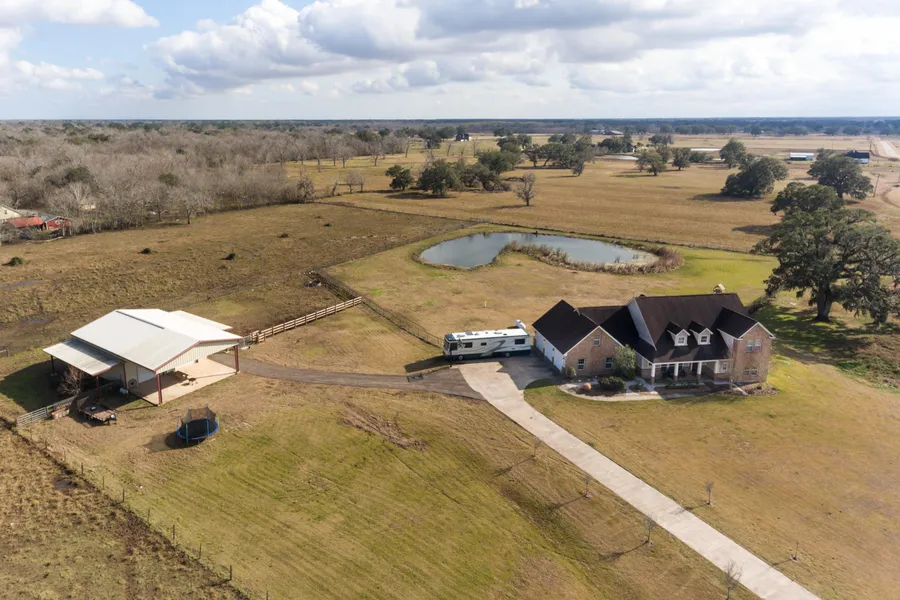Home w/Guest Suite, 3-Car Garage, Horse Barn & Pond on 15-Acre Ranch in Suncreek Ranch by FM 521, TX-288 & Proposed TX-99 (see map). 3400 Sqft Includes 3026 Sqft 3/2.5 Custom Home & 374 Sqft 1/1 Guest Suite Located Above Attached Garage. Custom Built Home has 2-Story Ceilings, Archways, Crown Molding, Bamboo/Slate Floors & Wall-of-Windows w/Expansive Views of Ranch. Media Room w/Wetbar. Study w/Built-in Shelves/Cabinets. Island Kitchen w/Granite Counters, Stainless Steel Appliances, Pecan Cabinets & Breakfast Bar. Screened Patio. 3-Car Attached Garage has Upstairs 374 Sqft Mother-in-Law/Guest Suite & Bathroom w/Shower. 540 sqft Attic Storage. 2 Gas Water Heaters. Pond Stocked w/Catfish, Bass & Brim. 500-Gallon Propane Tank. Cross-Fenced into Large Backyard & 3 Pastures w/100-Year Oak Tree, 40'x45' Insulated Metal Shop has Concrete Slab w/10' Overhang for Horses, 24' Overhang for Trailers/RV, 3 Roll-up Doors, Water, Electric & Shop Lights. Well has Water Softener & Reverse Osmosis Water System. Mixed Asphalt Driveway Recently Laid from Home to Shop. Ag Exempt for Cattle. Suncreek Ranch Deed Restrictions in Docs. Country Living w/Easy Commute to Downtown Houston & TX Medical Center. Watch Virtual Tour!