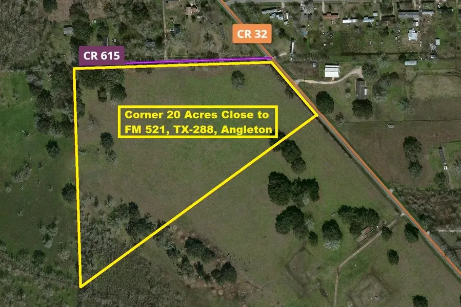 AG Exempt! Corner 20 Acres with ~1411' Road Frontage Close to FM 521, TX-288 & Downtown Angleton. Located on SW Corner CR 32 & CR 615 with ~360' CR 32 Road Frontage & 1051' CR 615 Road Frontage. Large Grove of Majestic Oaks & Pecan Trees Make an Excellent Home Site. Perfect for Hunting Deer & Hogs. Has Electricity but Needs Well & Septic. Minutes to the Gulf/Surfside Beach. Easy Access to FM 521/TX-288 Provides Easy Commute to Lake Jackson/Freeport & Dow/INEOS Chemical Plants 20 Miles Away. 40 Miles to Houston/TX Medical Center. Perfect for Residential Development or Ranch Home w/Livestock. Restrictions Do Not Allow Mobile Homes. Per Seller the property is at a Good Elevation on a Very High Ridge & Did Not Flood During Harvey. Additional 40-Acre Tract or 60-Acre Tract Available Either Separately or Combined.