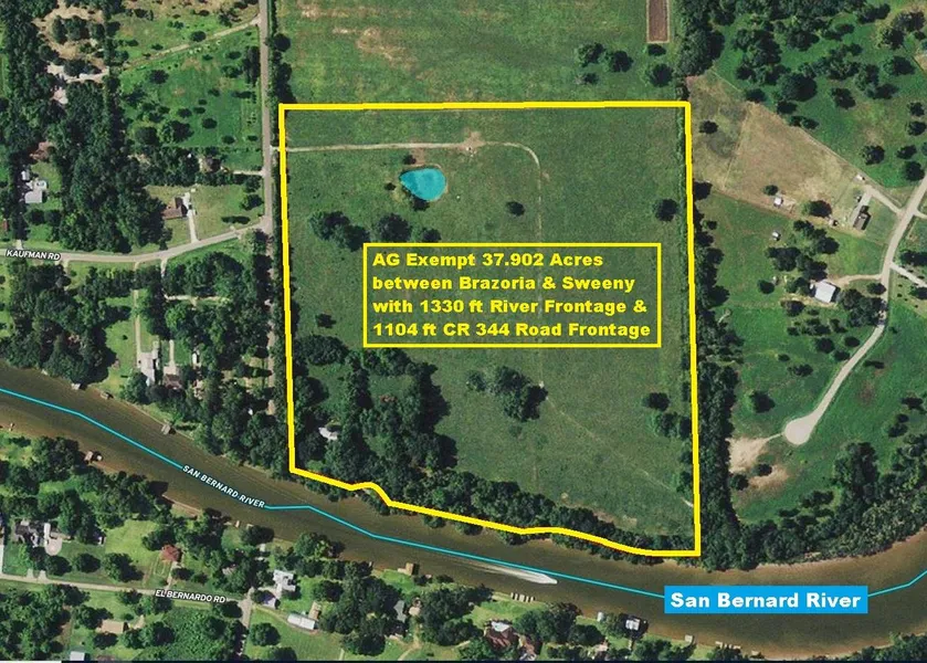 AG Exempt & Owner Financing Available. Riverfront 37.902-Acre Tract located between Brazoria & Sweeny with 1330 ft San Bernard River Frontage, 1104 ft CR 344 Road Frontage. Property is cleared with some good tree coverage and has 528 sqft a/c cabin w/attached 1-car garage, screened pavilion, 2 barns, Gazebo, pond, 2 water wells & 1 septic system. Tract is not located in any city limits or Extraterritorial Jurisdiction (ETJ). No Known Deed Restrictions or Zoning Laws. San Bernard River Area is home to many vacation/2nd Homes for Houston Area Residents & is Considered One of the "Best Kept Secrets" in Texas. Enjoy boating, fishing & skiing on the River that empties into the Intercoastal Waterway. Projected Plant Construction in the Area for Dow Chemical, Freeport LNG, Chevron Phillips Chemical, Phillips 66 & BASF are part of over $10 Billion in current projects underway for Lake Jackson/An...