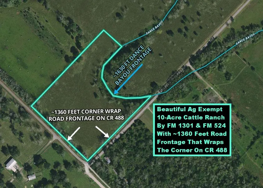 Ag Exempt! Beautiful 10-Acre Cattle Ranch By FM 1301 & FM 524 With ~1360 Feet Road Frontage That Wraps The Corner On CR 488. Improved Pasture With Partial Perimeter Fence. Dance Bayou Runs Along the Northern Border for ~1630 Feet With Clusters of Trees Lining The Banks. The Property Is Located 10.5 Miles NW Of West Columbia Via FM 1301 And 26 Miles South Of Wharton Also Via FM 1301. SH 35 And The Phillips Plant Are ~5 Miles South On FM 524 & Sweeny is 12 Miles South. SH 36 Is ~11 Miles East. Located Midway Between Houston & Freeport; Both Are 35 Miles Away. Lot 5 Is Part of A Larger Tract Totaling 61.7137Acres Which Is Also For Sale: Undivided or Subdivided Into 5 Lots Ranging from 10 Acres to 20 Acres. See Map in Attachments for Undivided Tract & Subdivided Lots. Pictures Represent The Entire 61+ Acres and May Not Be Part Of Lot 5. Buyer Purchases Survey. AN APPOINTMENT IS REQUIRED DUE ...