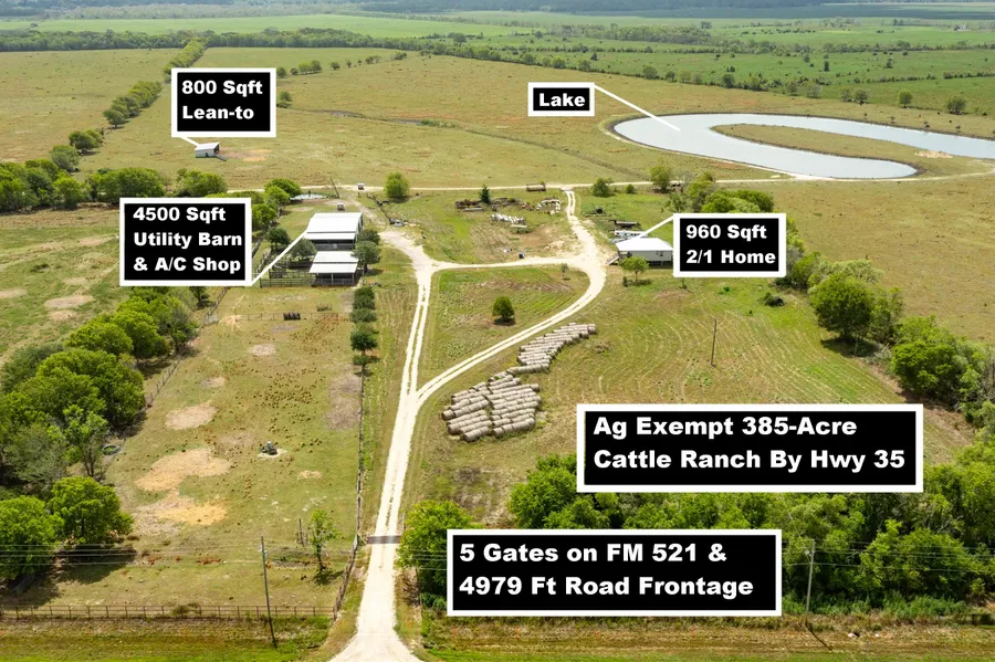 Ag Exempt 385.59-acres crossed-fenced cattle ranch less than 1 mile S. Hwy 35 Intersection has 960 SqFt 2/1 home, 4500 SqFt equipment barn with A/C shop, attached covered arena, squeeze chute/cattle pens/corrals/loading chute, 800 SqFt lean-to, tree-lined sloughs, 2 lakes, 4979 ft FM 521 road frontage w/5 gates & cattle guards. Property has a water well & an aerobic system. The site lies 5 miles W. of Hwy 288/Hwy 35 intersection, 6 miles W. of Angleton, 9 miles E. of West Columbia, 7 miles N. of Brazoria/Hwy 36, 21 Miles N. of Freeport & 45 S. of Houston. No restrictions per Deed. Partially in the Extraterritorial Jurisdiction (ETJ) of Baileys Prairie with the South portion in the County. Some trees are on the E. boundary & SE corner. The soils are a mix of Lake Charles & Bacliff Clays (best suited for grazing/hay production). 2 Sand pit-type lakes indicate that there may be good aggrega...