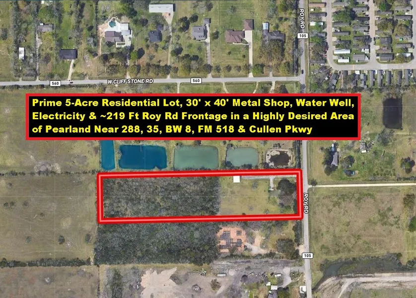 Prime 5-Acre Partially Cleared Residential Lot with a 30' x 40' Metal Shop, Water Well, Electricity & ~219 Feet of Frontage on Roy Road in a Highly Desired Area of Pearland Near Hwy 288, Hwy 35, Beltway 8, FM 518 & Cullen Pkwy. Residential Land is Scarce in Fast-Growing Pearland. Minutes to Schools, Police/Fire Depts, Tom Bass Parks, Pearland Town Center, Recreation Center/Natatorium & Hobby Airport. Short Commute to 4 Major Universities, Texas Medical Center & Downtown Houston via Beltway 8, Hwy 288, I-45 & 610-Loop. Zoned Residential. The Manufactured Home has been Removed! Restrictions Unknown & Buyer Needs to Verify. Survey Available. The Buyer will need to Install New Aerobic System. Contact Showingtime at 800-746-9464 to Walk the Property.