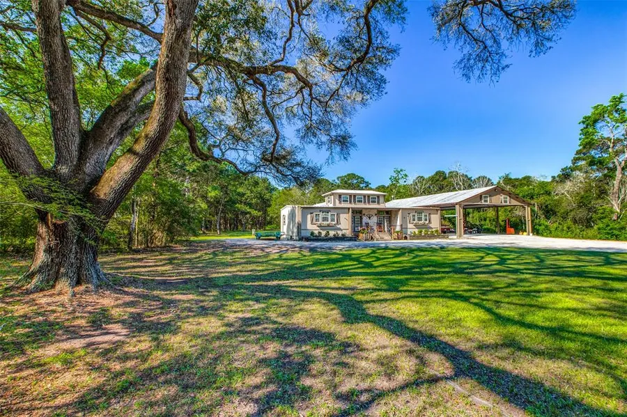 Located on approx. 7.2 wooded acres, this lovingly restored farm house w/guest house has been fully renovated & expanded to fit today's lifestyle. This unique property offers many possibilities.. quiet country living, weekend get away, wedding venue, B& B... just let your creative mind go to work. Both residences are privately situated & are surrounded w/beautiful large oak trees, which provide tranquility & shade, plus 2 ponds. The larger residence is approx. 2800 sq. ft. w/3-4 BR/3 full baths, high ceilings, reclaimed wooden beams, extra large island, farm sink & gorgeous designer touches throughout. Smaller house (currently rented) is 1100 sq. ft., 1 BR/1 full bath, large enclosed patio w/jacuzzi off bedroom & workshop. Two large high bay pole barns provide plenty of storage for a full sized RV, parking & shop area. Water & sewer service are provided by permitted wells & septic systems. Cool: high efficiency Mini-split units w/ heat pumps.