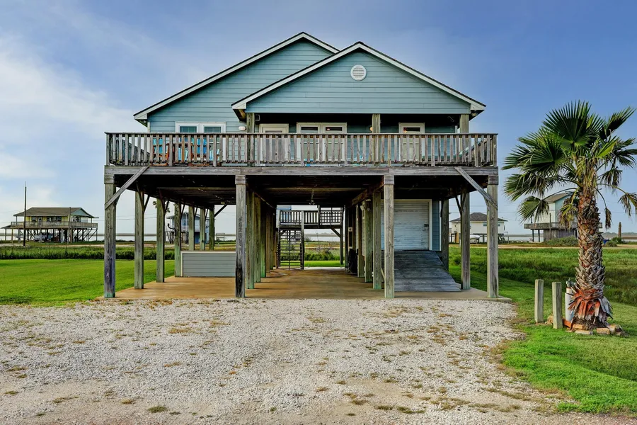 Custom, three bedroom, two bath home located in San Luis Beach subdivision. Amazing views of the bay and Gulf of Mexico from large decks. Spacious kitchen has custom beadboard cabinetry and granite counters. The kitchen has a bar height counter for extra seating in the dining area. Just off the kitchen (with access to the primary bath) is the utility room featuring two closets, one with washer and dryer hookups and the other for additional storage. Open living area with vaulted ceiling, recessed lighting, bamboo floors and views of both Gulf and bay. Large primary bedroom has views of the Gulf and en suite bath features custom beadboard cabinetry, granite counters with double sinks and linen closet. Secondary bedrooms are separated by bathroom with granite counter, tub/shower combo and linen closet. Two breakaway storage areas downstairs, including golf cart storage. Beach access just across Bluewater highway. Boat ramp located in the subdivision as well.