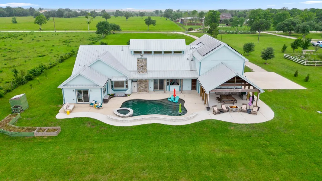 Fabulous, 4 bedroom, 3 full bath w/ 2 half bath, "Smart Home" with workshop located on 4.996 acres in the quiet, country subdivision of Mary V. O'Donnell in Brazoria County. The ceilings are high with wood beams and clerestory windows and the wood-look tile flows expansively throughout the first floor. This beautiful home offers an open floor plan with a large greatroom with fireplace, formal dining area, conversation area, study, upstairs gameroom and home theater. The chef's kitchen is amazing with marble countertops and top-of-the-line appliances including 8-burner Viking cooktop and double Bosch ovens. The primary retreat is fabulous with a large entry room and beautiful ensuite bath. 3 secondary bedrooms are all spacious. There's an outdoor kitchen with huge covered patio, cabana bath, fire pit and beautiful pool with sundeck and spa. If you are wanting to experience quiet, country living in a modern home with all the bells and whistles, then this is it! Welcome home!