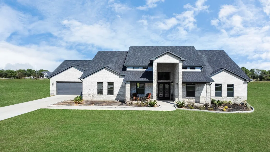 Nestled on 2 acres of serene countryside, this stunning custom-built single-story home offers luxurious living with modern elegance. Featuring soaring 12’ and 14’ ceilings, 8” baseboards, and an open-concept design, every detail exudes sophistication. The contemporary kitchen boasts an oversized island, sleek quartz countertops, and top-of-the-line GE Monogram stainless steel appliances. Enjoy Berber carpeting and wood-like tile throughout. The expansive primary retreat includes a spa-like ensuite with premium finishes. Secondary ensuite bedrooms provide comfort and privacy. Entertain in the game room overlooking the covered patio or unwind in the media room. Experience the perfect blend of country tranquility and city convenience in this exquisite home.