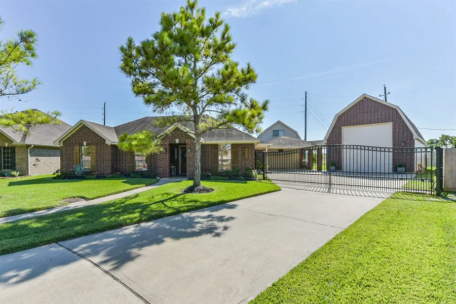 On a premium lake-view lot, this home offers flexible living space and impressive garage capacity for every need. The property includes a 2.5-car oversized garage with finished living space above and a convenient half bath, plus a massive 4-car boat/RV garage with upgraded electrical—perfect for storage or use as a workshop. A 2-car carport and long driveway allow parking for multiple vehicles behind a remote-controlled gate. Inside, the open floor plan features wood flooring, a gaslog fireplace, and a spacious kitchen with granite counters, a stand alone island, breakfast bar, stainless steel appliances including a gas cooktop, and upgraded cabinetry. The upstairs flex space is ideal for guests, hobbies, or a home office. Conveniently located near Hobby Airport, NASA, Kemah, and the beaches of Galveston, with easy access to the Texas Medical Center and downtown Houston. Make your appoin...