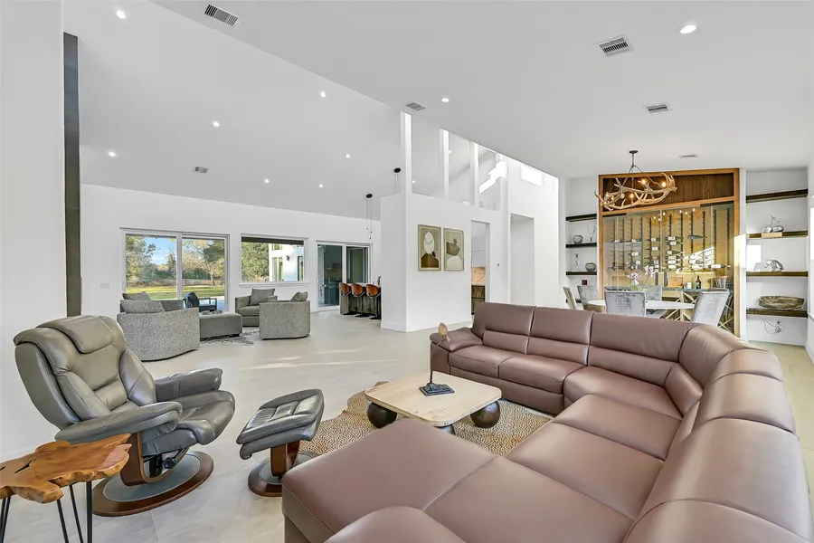 Luxurious one-of-a-kind custom new construction home situated on 1.77 acres. This stunning contemporary ranch home features expansive open living spaces, soaring ceilings, abundant natural light, and a full 1 bed/1 bath guest suite that is ideal for multi-generational living. There are 3 kitchens: the stunning main kitchen, a kitchen within the guest suite, and a commercial-grade chef's kitchen that is perfect for large scale cooking & entertaining. Designer finishes & additional features include a climate controlled wine room, sleek Italian cabinetry, imported Spanish tile flooring, an exercise room, en-suite baths in all rooms, 3 17-SEER two stage ACs, windstorm certified doors & windows, two 2-car garages & more. Outdoors, enjoy the large saltwater pool, covered patio & numerous mature oak trees, and the property is fully fenced with an automatic gate. Located close to schools, amenit...