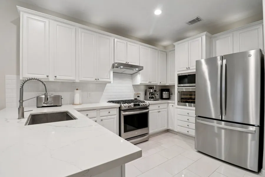 Beautifully updated home in a prime location with quick access to major highways, parks, shopping, and top-rated schools. Thoughtful renovations include a 2020 new roof, full interior paint, luxury carpet, Shaw Floorté engineered wood, and Daltile marble-style tile. The kitchen features quartz counters, subway backsplash, and a large undermount sink. Living room offers custom built-ins and an upgraded gas fireplace. Primary bath includes quartz counters, a larger walk-in shower, and frameless glass. Additional upgrades: marble powder room vanity, window tinting, Kohler toilets, updated switches, Nest thermostats, upgraded ceiling fans, new garage door springs, premium fiberglass entry door, cedar gazebo, extended patio, professional tree care, full pest & termite protection, and a whole-home security system.
