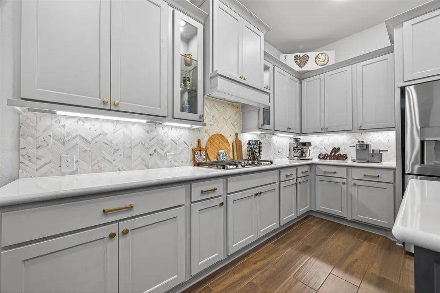 Step into this beautifully upgraded residence where thoughtful design meets modern luxury. From the moment you arrive, the premium lot and enhanced exterior elevation set the tone for a home that stands out. Inside, a fireplace extended to the ceiling creates a stunning focal point, while elegant wainscoting in the dining and master bedroom adds timeless character. The chef-inspired kitchen boasts upgraded countertops, glass cabinets with undermount lighting, and a spacious butler’s pantry perfect for entertaining. The office features custom built-in cabinetry, offering style and function. Retreat master suite with a freestanding tub, rain shower head, designed for spa-like relaxation. Outdoor living is elevated with an extended patio, complete with a gas line for grilling, and upgraded front light fixtures. Three car Garage with epoxy flooring and ceiling storage. Whole-house blinds an...