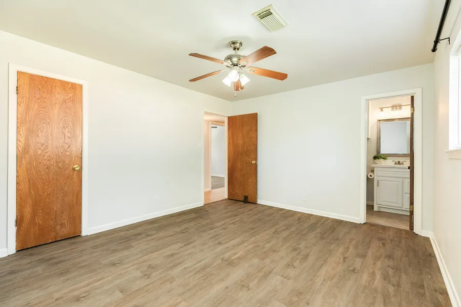 GREAT NEW PRICE! BEAUTIFUL & AFFORDABLE, MOVE-IN READY HOME WITH MODERN UPDATES! Welcoming covered entry & stunning front door set the tone. Enjoy a sparkling kitchen with refreshed finishes, quartz counters, marble backsplash, & a bar with storage that opens to the dining area. Bright, airy vibe throughout. Stylish tile in common areas & wood-look vinyl plank in bedrooms, plus upgraded lighting & fresh paint. Spacious primary bedroom with large walk-in closet & a gorgeous bath; beautifully updated secondary bath. Expansive living area with cozy wood-look accent wall. Flexible formal living room off the entry—perfect for an office, music/craft space, media room, or homeschool setup. Dining Area open to Kitchen and Living Area feature French doors which lead to an enormous, fenced backyard with two patios for entertaining, relaxing, or play. Double-car garage with workbench adds convenience. Come see the thoughtful updates, spacious living areas, & amazing outdoor space in person!