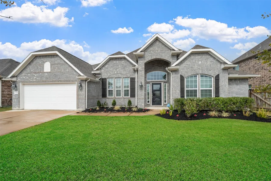 Beautiful single-story home in Angleton featuring a spacious open split floor plan. Enjoy low taxes and no HOA! This home offers 3 bedrooms, a large flex room, 2.5 bathrooms, and a 3-car tandem garage. The oversized covered back patio and fully fenced backyard are perfect for relaxing or entertaining. The open-concept layout includes a kitchen that boasts a large breakfast bar, center island, walk-in pantry, abundant cabinetry, quartz countertops, and generous counter space. The primary suite is bright and airy with high ceilings, ample natural light, and a ceiling fan. The en-suite bathroom features a luxurious soaking tub and plenty of storage, while the spacious primary closet provides excellent organization space. Secondary bedrooms include large walk-in closets and share a convenient Jack-and-Jill bathroom with double sinks.