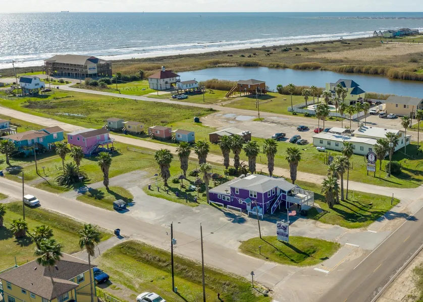 Surfside Beach Double Corner 21559 sqft Lot by TX-332 with ~2500 sqft Restaurant, 2nd Floor ~728 sqft 2/1 Apartment, ~88 ft CR 257/Bluewater Hwy Frontage & ~260 ft Ocean Ave Frontage. Beach Access at End of Ocean Ave Just 4-Minute Walk Away. Kitty's Purple Cow is an Award-Winning Restaurant & Local Favorite which serves burgers, seafood, salads, beer & wine to locals & tourists that come to Surfside Beach. Price Includes FFE! Restaurant has fully outfitted kitchen, dining rooms, his/her bathrooms, bar & attached carport! 2nd Floor Apartment has separate entrance, covered porch & sundeck above carport. Additional land next to building provides ample parking, an outdoor eating area, storage building & circle driveway with multiple entrances from Ocean Ave & Bluewater Hwy, which is the main hwy connecting TX-332 bridge to San Luis Pass. Most of the residential neighborhoods must pass by property to get to beach, so local residents/tourists visiting beach will have to pass by property on their way home. Only 10 Miles to Freeport Chemical Plants & 25 miles to Galveston Island, University of Texas Medical Branch and Texas A&M University at Galveston! The size of the restaurant estimated by measuring aerial photographs came out to be ~2500 sqft & does not include the apt. All measurements are estimates so Buyer needs to verify. Showings Will Be Accompanied & Require 24-Hour Notice. No For Sale Sign! Public Water & Septic System however, City Sewer is Available. Buyer Purchase Survey!
