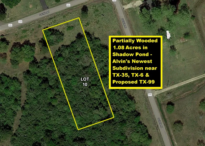 Only One Lot Left in Shadow Pond! Country Living at its Best in Alvin's Newest Subdivision near TX-35, TX-6 & Proposed TX-99. Partially Wooded 1+ Acre Lots Available by Corner of CR 326 & CR 136. Lot 10 is 1.08 Acres w/CR 136 Frontage. Adjacent Lots No Longer Available For Sale (see Map). Located in Alvin ETJ w/Light Restrictions. Custom Homes or Barndominums Allowed. NO Manufactured Homes Allowed. Close to Alvin Schools. No Water or Sewer Available. Buyer Needs to Install Well & Septic. Each Lot Features its Own Unique Setting Close to Mustang Bayou w/Mature Trees. Don't Miss this Opportunity to be Part of a Beautiful Rare Residential Community 40 miles to Hobby Airport, Galveston, Freeport, Houston & TX Medical Center with easy access to TX-35, I-45 & TX-288. TX-99 (Houston's Largest Loop) when completed will span 180 miles connecting League City-Rosharon-KatyTomball-Baytown (See Maps)...