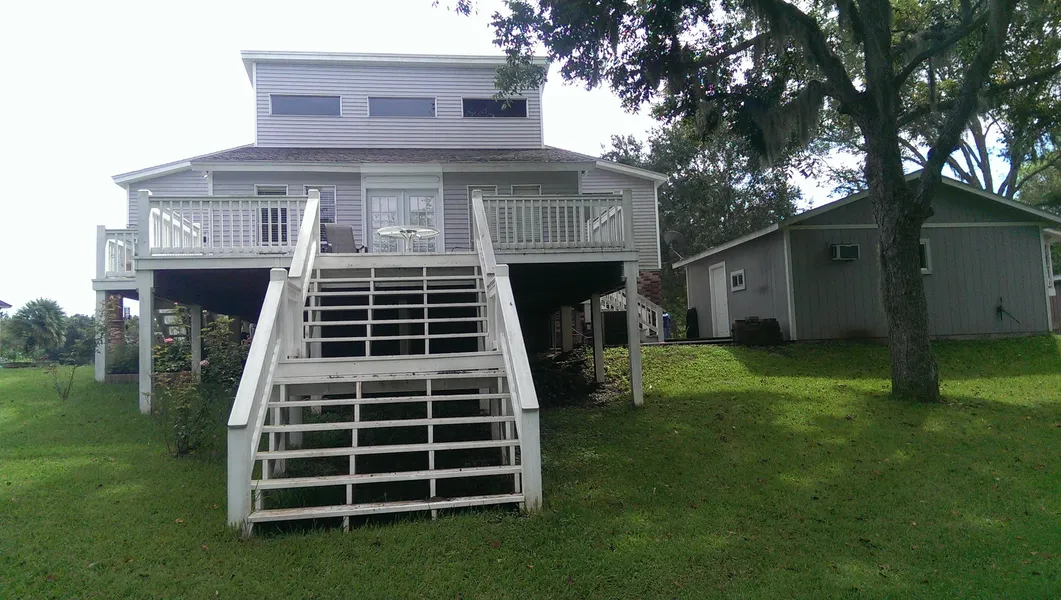 Beautiful split level home remodeled in 2013 with lots of room. 2009 appraisal has sq.ft. at 2558. 102 feet of bulk headed San Bernard River provides a peaceful setting to unwind or enjoy the river. Large deck overlooks the water and a covered patio allows you to enjoy the outdoors rain or shine. Three levels, bottom level consists of the foyer, large master bedroom, bath, and office. Second level has the living room with a large deck overlooking the river. The third deck has the kitchen, dining, a small deck, three bedrooms and bath. Brazoria CAD has square feet at 1680.