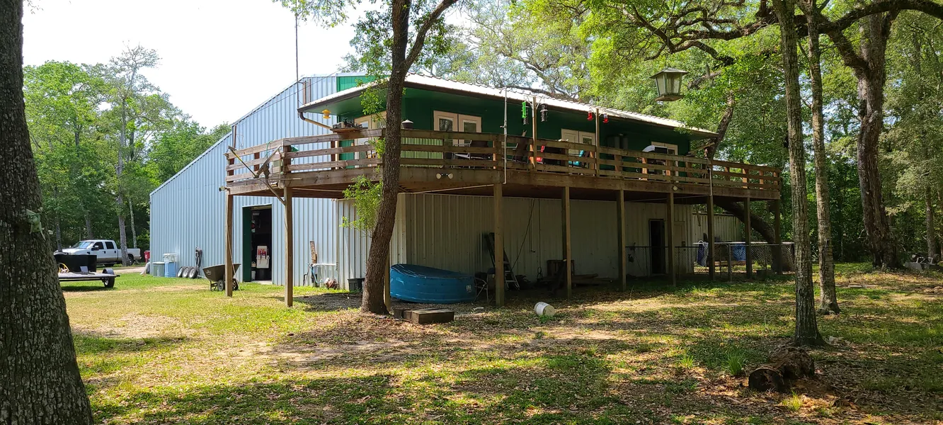 Beautiful property that's very secluded. Home is upstairs and is approximately 900 sq. ft. Ground floor is a large workshop with 3216 sq.ft.(via appraisal district) perfect for warehousing supplies or building projects. Large deck upstairs puts you at ease as nature and wildlife surrounds you. This deck also overlooks a covered area with hot tub and outdoor firepit. Scattered liveoaks provide ample shade but plenty of space for grazing. Two outbuildings for tons of storage. Three separate tax numbers make total taxes close to $2,488.00 annually with homestead exemption. All appliances stay as well as a zero-turn Toro mower and Kubota tractor.