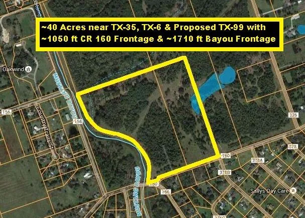 Owner Financed! AG Exempt! ~40 Acres near TX-35, TX-6 & Proposed TX-99 w/~1050 ft CR 160 Frontage & ~1710 ft Bayou Frontage. Needs Well & Septic! Total 173 Acres Available For Sale (See Pic)! Surrounded by Large Residential Tracts! Proposed 4-Lane Grand Pkwy/TX-99 (Houston's 3rd Loop) will span 180 miles from League City-Rosharon-Katy-Tomball-Baytown (See Maps)! 40 miles to Hobby Airport, Galveston Beach, Freeport, Houston Downtown & TX Medical Ctr. Restrictions Allow Livestock & Horses, but no Hogs or Mobile Homes! See Restrictions in Docs & View Drone Video! Contact Capital Farm Credit for Loan!