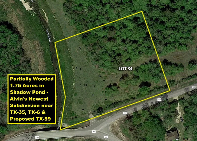 Country Living at its Best in Alvin's Newest Subdivision near TX-35, TX-6 & Proposed TX-99 called Shadow Pond. 1+ Acre Partially Wooded Lots Available by Corner of CR 160 & CR 326. Lot 34 is 1.75 Acres w/CR 160 Road Frontage. Adjacent Lots Available For Sale (see Plat). Located in Alvin ETJ w/Light Restrictions. Custom Homes or Barndominums Allowed. No Manufactured Homes Allowed. Close to Alvin Schools. No Water or Sewer Available. Buyer Needs to Install Well & Septic. Each Lot Features its Own Unique Setting Close to Mustang Bayou w/Mature Trees. Don't Miss this Opportunity to be Part of a Beautiful Rare Residential Community 40 miles to Hobby Airport, Galveston, Freeport, Houston & TX Medical Center with easy access to TX-35, I-45 & TX-288. TX-99 (Houston's Largest Loop) when completed will span 180 miles connecting League City-Rosharon-Katy-Tomball-Baytown (See Maps)! Appointment Required to Walk Property.