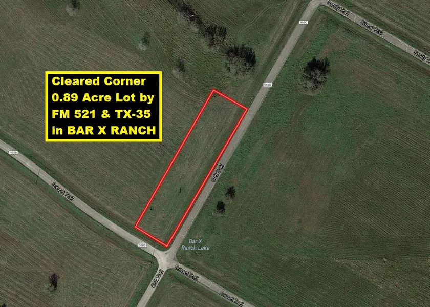 Cleared Corner Lot by FM 521 & TX-35 in Quiet BAR X RANCH Community W/Custom Built Homes & Many Amenities: Tennis Courts, Baseball Field, Basketball Court, Pavilions, Campgrounds, Swimming Pools, Stocked Lakes, Lake House, Clubhouses, Boat Ramp, Fishing Pier (see maps). Gaze at Sky Full of Twinkling Stars & Breathe Clean Air. Enjoy Deer, Bald Eagles & Water Fowl in Their Natural Habitat. Minutes to Lake Jackson, Brazoria, Angleton & West Columbia. Minutes to TX-288 makes commute a breeze to Houston, TX Medical Center, Pearland, Freeport & Lake Jackson. Deed Restrictions under Docs. Lot has 95 ft Sunset Trail Road Frontage & 409 ft Colt Trail Frontage. LOW TAXES! NO MUD TAX! 20 Miles to Freeport. 25 Miles to Surfside Beach. 45 Miles to TX Medical Center & Hobby Airport. 50 Miles to Downtown Houston. Needs Well & Septic Installed.