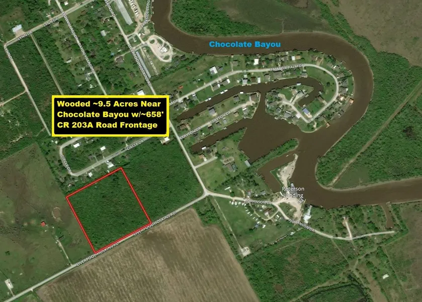 Wooded 9.5+ Acres Near Chocolate Bayou w/650' CR 203 Road Frontage & Multiple Entrances. Property is called Tract B & is Part of 19 Acres For Sale. Adjacent ~9.5 Acres called Tract A is also Available For Sale Together or Separately. Minutes to TX-35, Alvin Community College, Liberty Post Office & Fire/Police Dept. 12 Miles to Alvin Chemical Plants! 25 Miles to Freeport Chemical Plants & Lake Jackson. 30 Miles to Texas City Refineries & Galveston Island. Well & Septic will need to be installed! Very Low taxes! No HOA Fees! Can be Commercial, Residential or Multifamily Development! Outside Liverpool City Limits. *Contact Texas Farm Credit for a loan!* Verify Restrictions!
