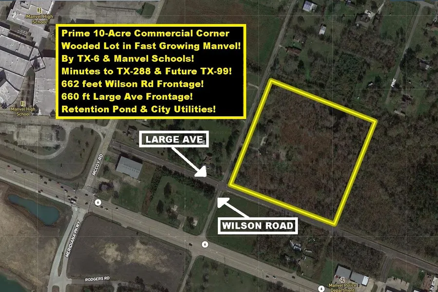 Prime 10-acre Commercial Corner Lot in fast Growing Manvel visible from TX-6 & Wilson intersection just 1 block E. of Manvel High School, 1 block N. of TX-6, 2 blocks W. of FM 1128/Masters & 3 miles E. of TX-288. The property is cross-fenced & heavily wooded with a pond, home, 2-car garage, detached workshop, and road frontage on Wilson Rd (662 ft) & Large Ave (660 ft). Platted roads on the E. boundary (Pine 656 ft) & the N. boundary (Cannan 664 ft) are not built yet. Within Manvel City Limits with all City Utilities. Zoned Light Commercial & is perfect for professional/medical office development, building a new home, or holding for investment. TX-6 & FM 1128 intersection is a major hub with Manvel City Hall, C-Stores & retail on each corner. Easy commute to Downtown Houston, Texas Medical Center & Hobby Airport. Many master-planned communities (Sedona Lakes, Lakeland, Bluewater Lakes, D...