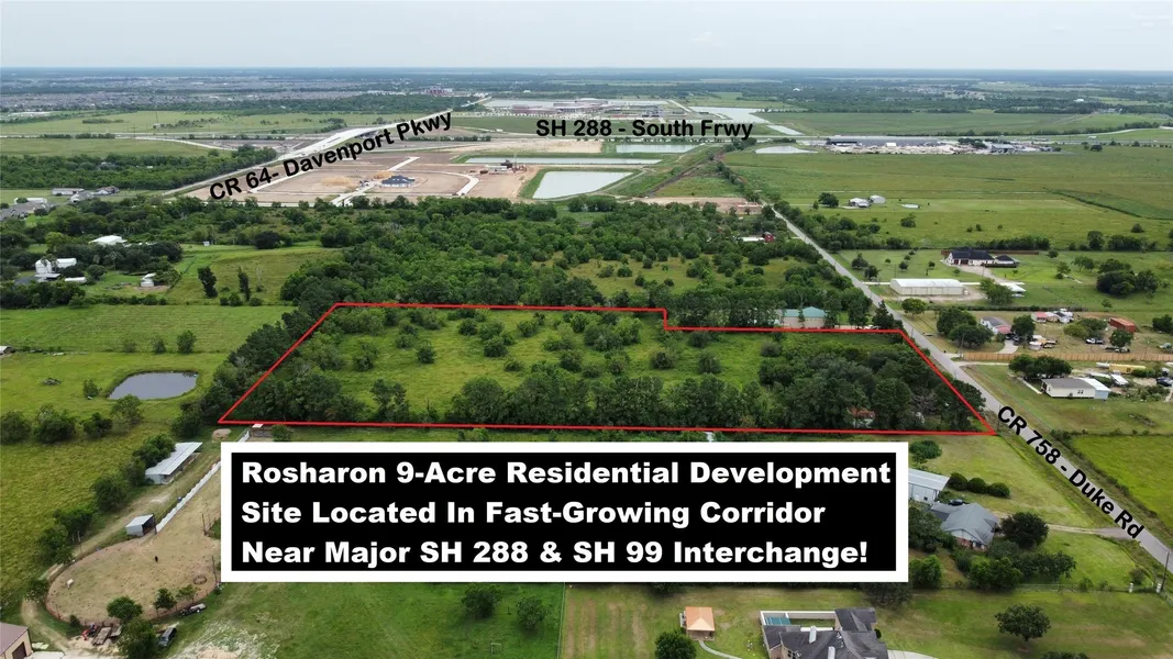 Rosharon 9-Acre Residential Development Site Located In Fast-Growing Corridor Near The Major SH 288 & SH 99 Interchange! This versatile property features 371 feet of frontage on CR 758, offering diverse potential for housing, agriculture, or equestrian facilities, pending buyer verification. Its strategic location provides seamless access to SH 6, SH 288, SH 35, I-45, & future SH 99, connecting to Pearland, Manvel, The Medical Center, Hobby Airport, Downtown Houston & several universities. Strong connectivity to employment centers (Freeport, Houston) drives future value. A flexible investment for strong returns, this site is perfectly suited for a village of rental homes, a single-family home neighborhood, dog kennels, horse-boarding stables, condos, townhomes, or apartments. The 180-mile SH 99 will encircle Houston, touching 7 counties. Currently, the undeveloped segments C & B are slat...