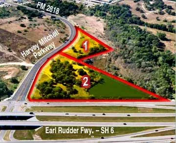 The two contiguous tracts are at the northwest corner of the intersection of Earl Rudder Fwy. and Harvey Mitchell Parkway. Total frontages are 1300 ft. on Harvey Mitchell Parkway (FM 2818) and 1600 ft. on Earl Rudder Freeway (SH 6).