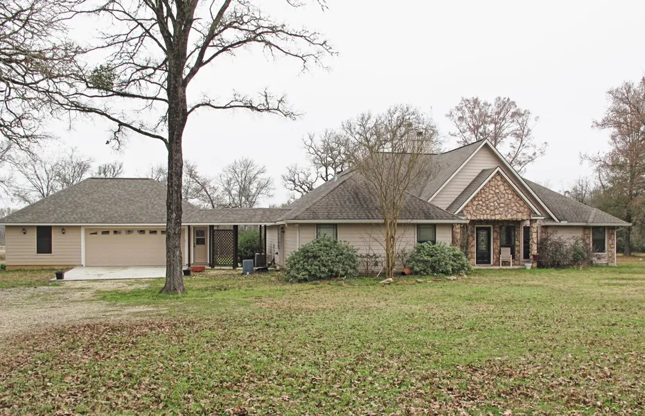 Remarkable 4/2.5 home on private 10 acres. Location, location, location! Gated subdivision entrance with few home sites within 15 minutes of Bryan. This home is situated at the end of the road with tons of privacy. Watch the deer, catch the fish, or just sit out under the huge shade trees and relax to your heart's content. Great room has magnificent cathedral ceilings; open floor plan; large island with bar and extra sink; grand exterior view from within the comforts of home; two living ares; two dining areas, complete with one table and chairs with built-in corner seating. This lovely home has lots to offer a family who loves the outdoors.
