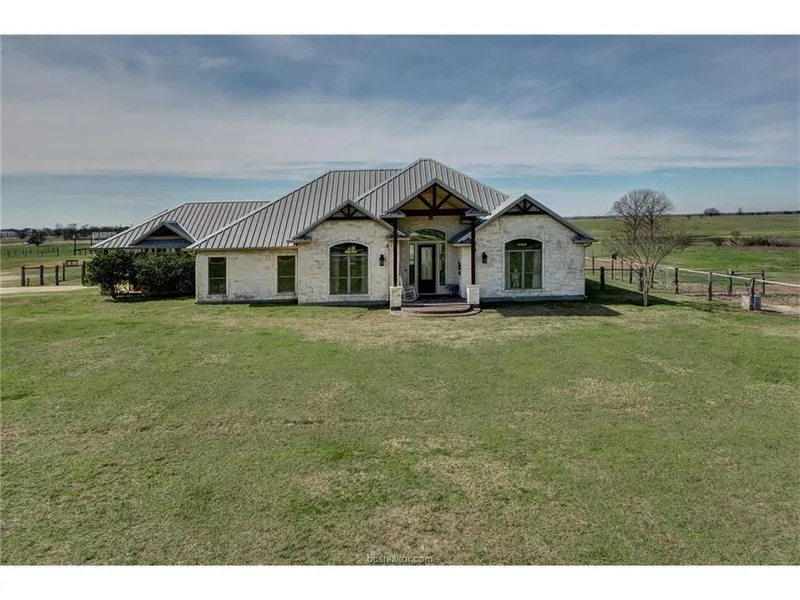 Live the country lifestyle on this Aggieland equestrian estate situated on 28 acres, just 5 minutes from town. Gated entrance leads to hill country style custom home with metal roof. Interior features include vaulted & raised ceilings throughout, split floor plan, and granite countertops. Kick your boots off and enjoy gorgeous views of sunsets from your back porch. Hardi-plank barn with metal roof has 6 stalls, concrete aisle with brick inlay, tack room, and feed room with roll up door. Perimeter and cross fenced with 5 ft tall horse field wire for added safety. Property has approximately 1600 ft of road frontage, seller will consider dividing acreage subject to plat approval from city.