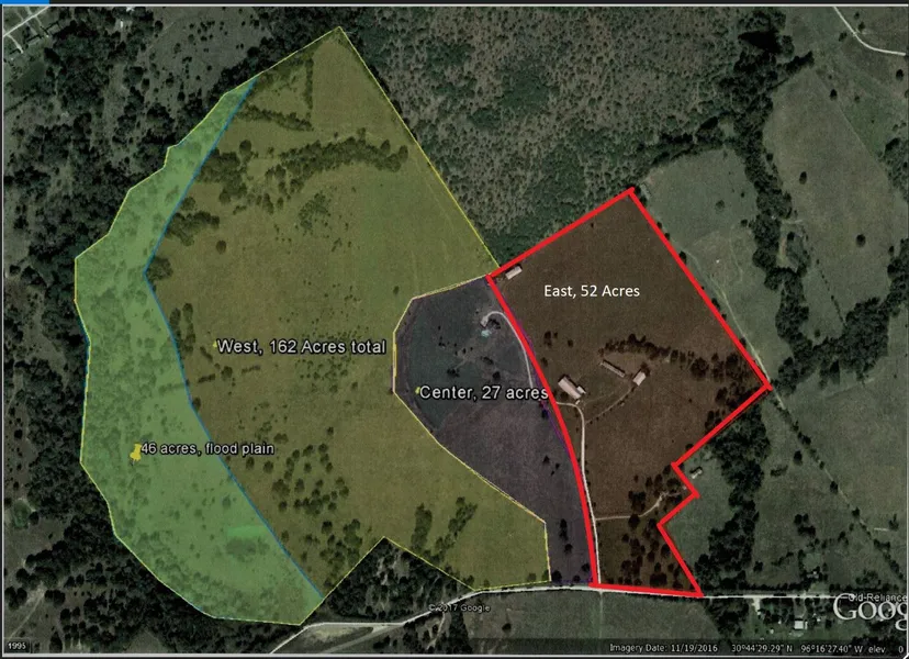This listing is for the east side of the property and not the entire property, see divided map in the pictures. This parcel is perfect for a smaller ranch with a hay barn, implement shed, barndominium, workshop, fencing and cross-fencing, water well and electricity. Property is 20 minutes from Kyle Field, and perfectly suited for that game-day retreat!
