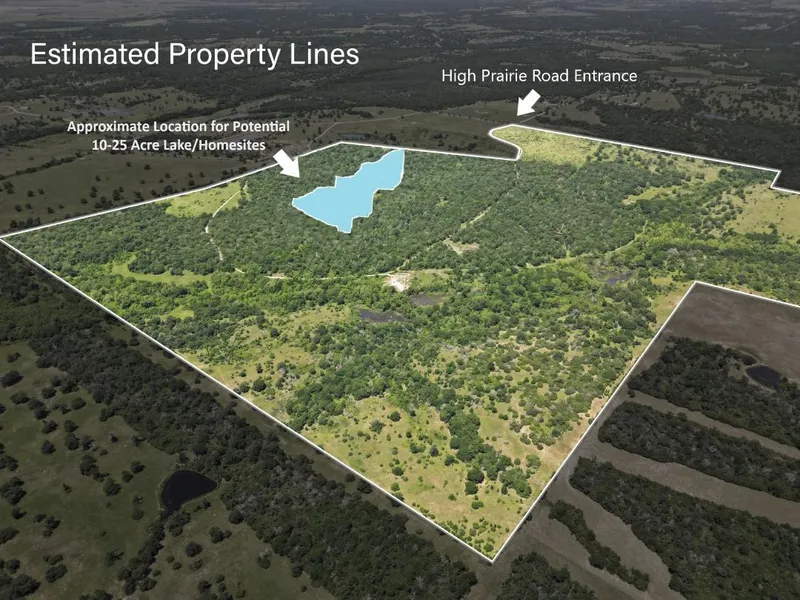 Embrace the opportunity to create your own Private Legacy Ranch. Experience the rugged ranch terrain transitioning from High Prairie Road to the Brazos River Bottom. There are multiple potential sites for your custom home to be nestled amid the trees, surrounded by natures beauty. There are currently multiple existing bodies of water, and the topography lends itself to adding an additional 10-25 acre lake. From nature trails winding through dense forests, to peaceful ponds and streams, this property invites all outdoor enthusiasts.