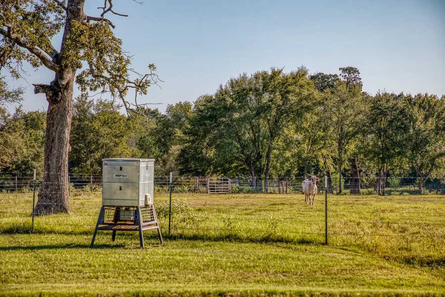 The land is fully fenced and cross-fenced with rolling pastures, mature pecan trees, and multiple ponds (including one with a fishing pier). Wickson Creek forms much of the back boundary. Wildlife is abundant, and the setting is private, with the home tucked behind a gated entrance and screened by mature trees.