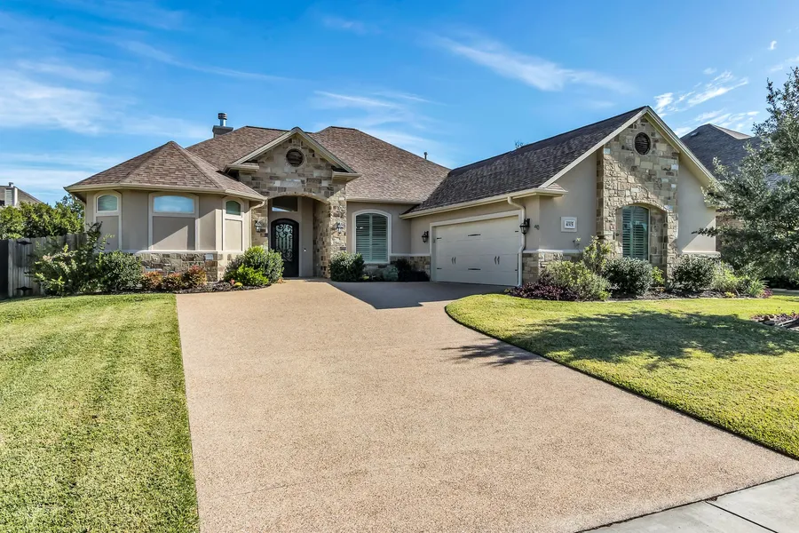 LUXURY GLENN THOMAS HOME IN CASTLEGATE II!! Wonderfully positioned in one of south College Station's most sought after communities, this professionally designed home boasts an open and comfortable 3-way split floor plan, custom kitchen, lovely living room framed by a floor to ceiling stone fireplace and windows overlooking the back patio, formal dining and breakfast room, a sprawling master suite, an en-suite bedroom and two additional bedrooms with a shared hall bath. The fabulous mud, pantry and utility rooms are complete with wonderful built-ins that provide convenient and easy access from the 2-car garage.