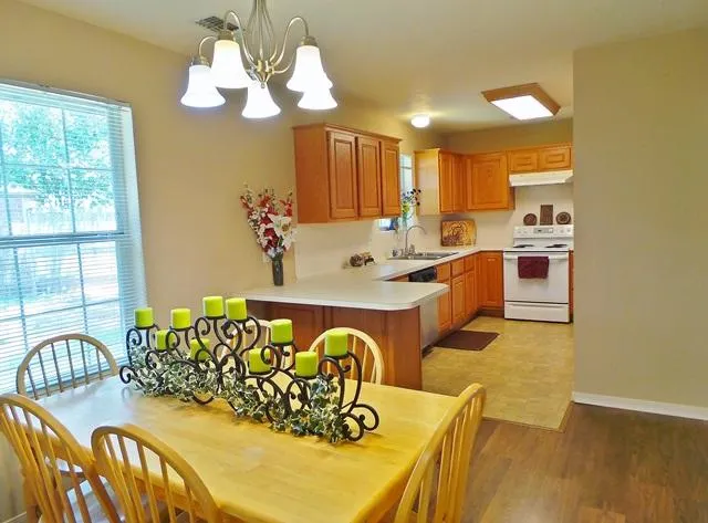 Flaunting all new paintinterior and exterior for a spotless look! Corner lot with terrific curb appeal marked with shade trees and manicured landscaping. Welcoming atmosphere as you enter the bright comfortable living room enriched with warm laminated wood flooring.