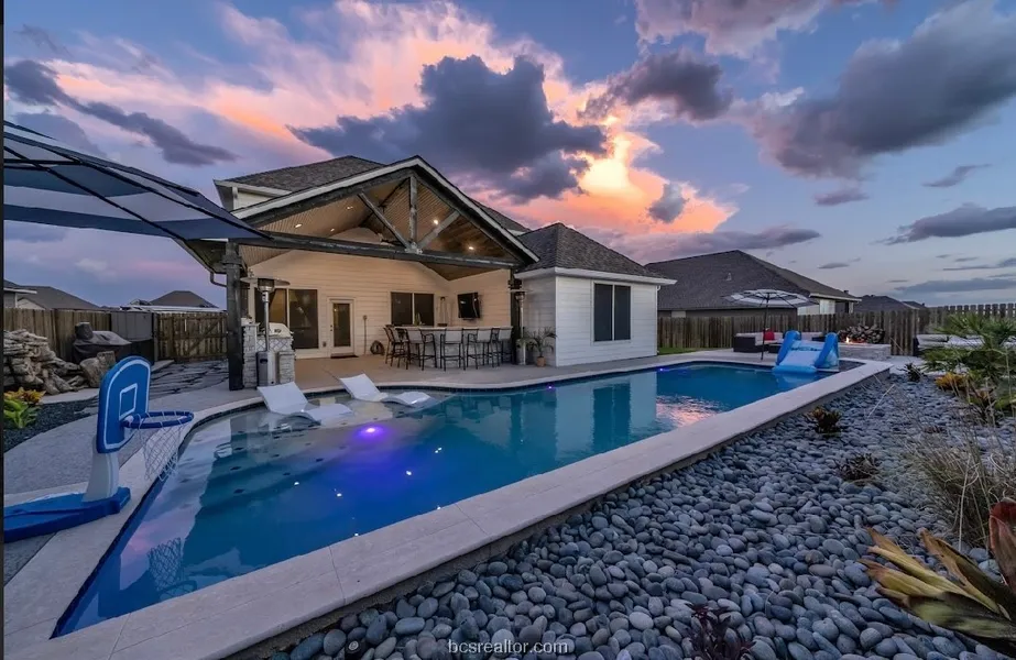 Stunning home with luxury features in the highly sought after Edgewater subdivision! This spacious 4 bedroom 3.5 bath home welcomes you with a captivating chandelier and high ceilings. The uniquely designed kitchen offers enough space for all those gourmet dinners, designed with all white cabinetry, granite countertops and black appliances. Off the kitchen you will find the master living room with gas fireplace, large windows and custom blinds throughout. The master suite is situated perfectly in the home with plenty of room and offers an oversized master shower, large garden tub, his/her vanities and also features a spectacular master closet. Upstairs you will find 3 large bedrooms and a bonus room big enough for an office or kids play room. Relax in the backyard on those hot summer days or enjoy entertaining for friends and families in the in-ground swimming pool and outdoor kitchen.