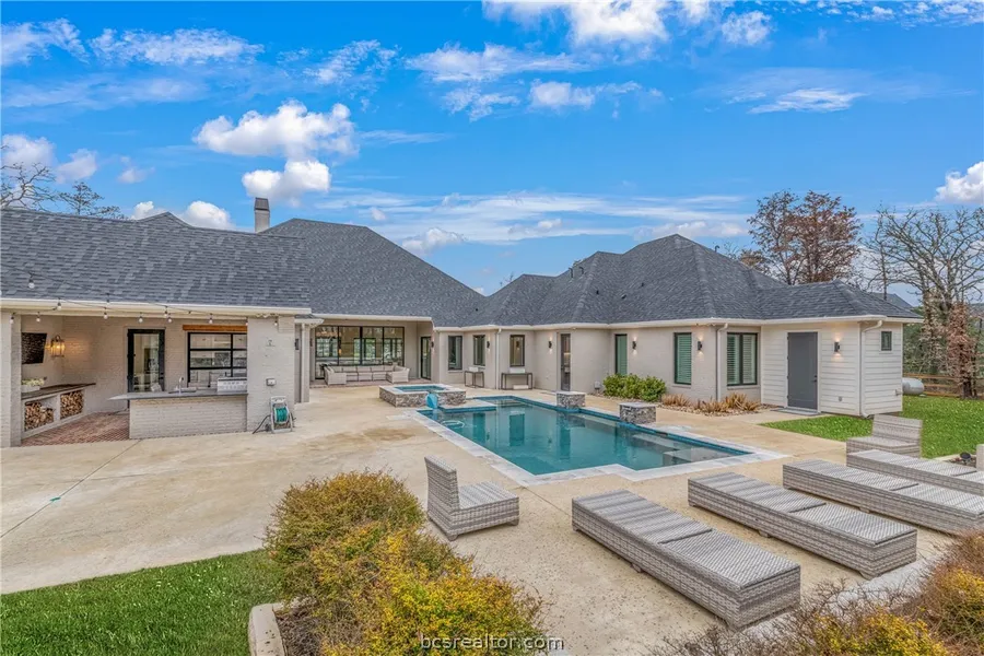 Nestled on a gorgeous 1-acre lot, this meticulously crafted custom home offers a blend of luxury and comfort. Featuring 4-bedrooms, 4.-full in suite bathroom, and 2 half baths one on each side of the home, each bedroom boasts its own ensuite bathroom, while 2 bonus rooms offer versatility—one adjoining a bedroom, creating an expansive space, and the other nestled among guest bedrooms with built-in desks. The open floor plan is highlighted by a gorgeous full masonry fireplace with a concrete finish in the living room, and a stunning kitchen featuring a gas stove and a grand 14.8-foot island with double sinks, double ovens, and a six-burner stove. The primary suite wing is a sanctuary unto itself, with a lavish bedroom and an indulgent bathroom showcasing dual closets, double vanities, a soaking tub, and an oversized shower with multiple shower heads. Additionally, on the primary suite side, discover a study overlooking the serene pool, a convenient laundry room, and mudroom/lockers. The highlight of entertainment is the game room, boasting clear garage doors overlooking the pool and pavilion, complete with an ice maker, microwave, sink, and a full-size fridge. Outdoors, a dreamy pavilion awaits, boasting a full outdoor kitchen, a shimmering pool with water features, a hot tub, a covered patio, and an outdoor shower. With a 4-car garage and porte cochere, parking for cars and toys is effortless. Schedule your private tour today.