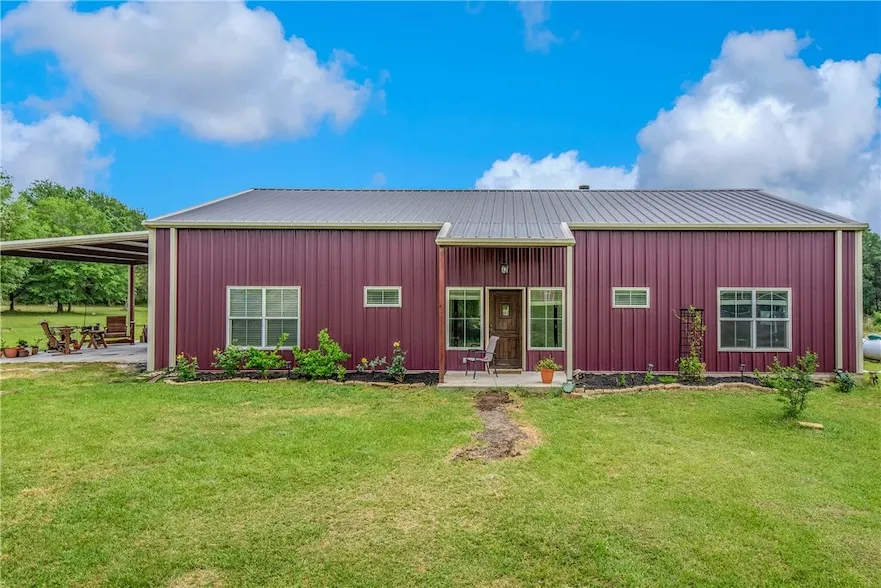 Don't let the rugged private road deter you from claiming this tranquil retreat. Extremely nice barndominium on over 10 lush acres with a pond that is just under 2 acres. The home features a large open kitchen, dining and living area with a massive stone fireplace. Three oversized bedrooms, two with en-suite bathrooms and the third with a hall bath that doubles as a guest bath. Granite countertops in the kitchen and all bathrooms. There is a porte-cochere for covered parking as well as a covered patio facing the pond. There are two RV parking spots complete with electricity and septic, ideal for additional living or guests. There is a path cut to go around the pond. The back left quadrant of property provides a large area good for gardening or farming. Versatile land, could be used for Cattle. Pond has bass, catfish, bluegill, deep pond - almost 20 feet at one point. There is an overflow drain from the lake to the creek on back of property for enhanced drainage. Most of the property has been cleared of underbrush, enabling more enjoyment and use. Will sell zero turn mower, tractor, fridge, electric car charging station, and Starlink. Furnishings are negotiable. The antler chandeliers and table stay with the home. The chicken coup does not convey with the property.