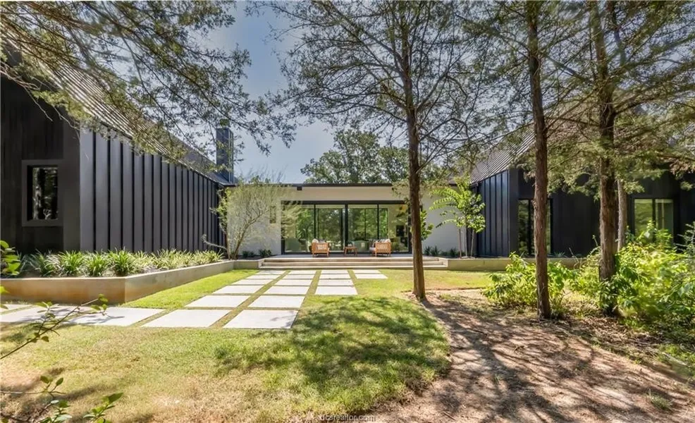 STUNNING ARCHITECTURAL RETREAT ON 12 ACRES! No expense has been spared in this never-lived-in, one-of-a-kind 12-acre retreat nestled among rolling, tree-covered hills. This architectural masterpiece features a modern exterior with Brazilian charred cedar siding, a 22-gauge metal roof and wall panels, and separate His and Hers garages with epoxy flooring. Inside, massive Western Window sliding doors flood the open living, dining, and kitchen areas with natural light. The living room centers around a floor-to-ceiling Isokern wood-burning fireplace, while the show-stopping kitchen boasts a beveled-waterfall island, exclusive Poggenpohl cabinetry, a 48" Cafe range, custom matte black vent hood, open shelving with lighting, and custom wood accents. The powder bath stuns with designer wallpaper, rare blue quartz counters, and backlit mirrors. The luxurious primary suite features motorized shades, designer wallpaper, a coffee bar, and a vast walk-in closet. Its resort-style bath offers Poggenpohl vanities, a large walk-in shower, and a massive standalone tub with a ceiling-mounted filler. A private screened-in porch includes a ceiling heater and backyard access. The split floorplan offers two more spacious bedrooms, designer baths, space for a home gym, a fully insulated quiet room or study, and dual laundry rooms. A whole-home audio system makes this home perfect for entertaining. This is Colorado-style living in Texas - Truly a once in a lifetime property!