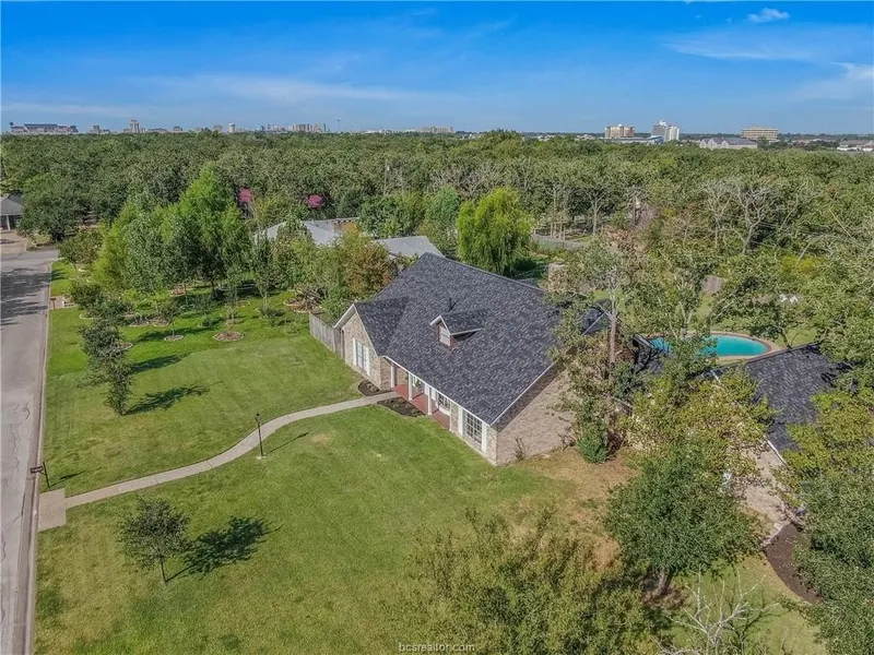 Located in the heart of College Station and just 1.4 miles from Texas A&M University, this traditional home on a .67 acre lot is a rare find. From the moment you step into this special property, you’ll feel welcomed by the warmth and character of this unique home. Beautiful wood flooring and natural sunlight fill the formal living and dining rooms. The cozy den with fireplace and brick pavers overlooks the private backyard, pool, and towering native foliage along the rear fenceline. The kitchen is adjacent to both the formal dining room and inviting breakfast room, overlooks the den and features double ovens and abundant counter space. A quiet office with stunning millwork and extensive display cabinetry and bookcases provides the perfect place to work or study with serene views of the sprawling back lawn. Throughout the home, thoughtful details shine: oversized closets, generously sized bedrooms, and a freshly repainted interior. Mature trees and dense woods along the back provide exceptional privacy and a serene backdrop. Perfectly located on Post Oak Circle, you’re minutes from Texas A&M, shopping, dining, and easy access to Hwy 6 while still enjoying the peace and privacy of a quiet cul-de-sac.