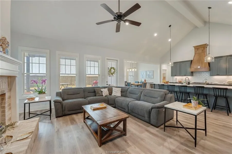Beautifully maintained 2022-built home in the highly sought-after Mission Ranch community of College Station. This open-concept layout features a vaulted ceiling in the living area, creating a bright and spacious feel. The living room offers a wood-burning fireplace with gas starter, and gas logs convey. The kitchen includes quality cabinetry, ample counter space, a central island, and a built-in mini fridge—perfect for entertaining. A convenient mud room off the garage adds everyday functionality and storage. The private primary suite features a well-appointed en-suite bath and generous closet space. Enjoy added privacy with no direct rear neighbors—the home backs to a school property, offering open views and typically quiet evenings and weekends. Covered patio and backyard ideal for relaxing or entertaining. Mission Ranch amenities include a clubhouse, pool, lake, parks, and scenic trails, minutes from shopping, dining, and Texas A&M.
