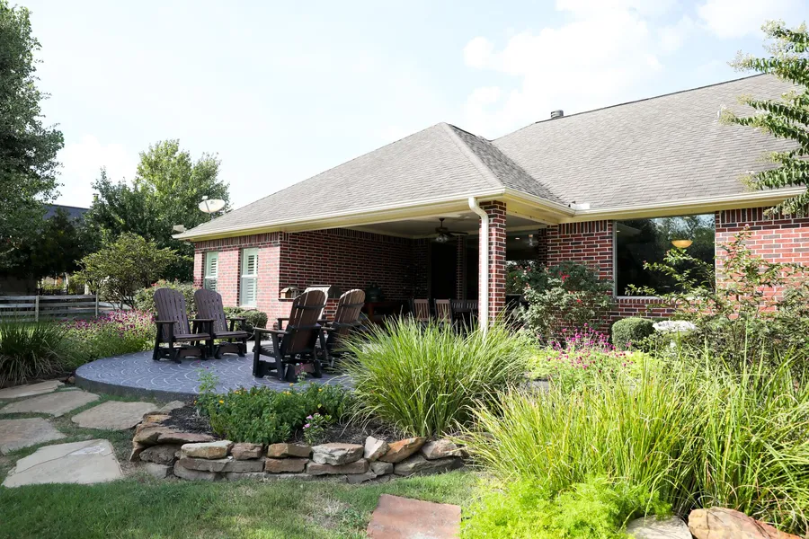 -Tall windows bring in natural light and give you the perfect view of the extensive landscaping with water garden feature and outdoor grill.